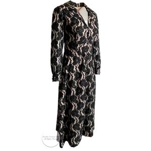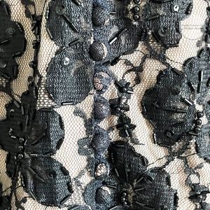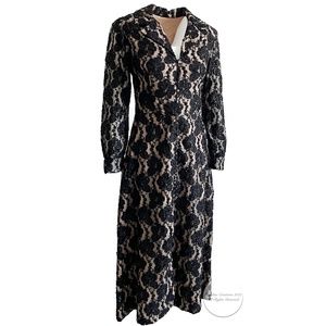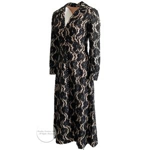 Vintage Black Beaded Illusion Lace Opera Coat. Unusual and striking piece. Fastens with tiny lace-covered buttons all the way down, allowing one to wear as a dress as well. Fully-lined/dry clean only. No size tag, fits like M: shoulders - 16.5in, bust - 36in, waist - 27in, hips - 38in, sleeves - 22in, shoulder to hem - 52in. Vintage/preowned: loose stitching on one area of the nude lining, some missing beads and sequins, and small holes in lace netting (hard to see unless closely inspecting)