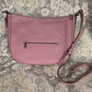 Brand New! Chic mauve leather shoulder bag by Coach. Comes with an adjustable strap and silver hardware. Short shoulder strap has 7.5” drop. Long shoulder strap is adjustable up to 38” long. Bag is 10.5” tall and 13.5” wide. Exterior zip pocket. Three interior slip pockets, one with magnetic clasp.