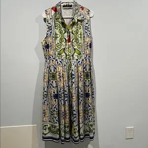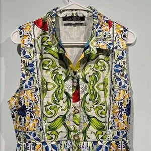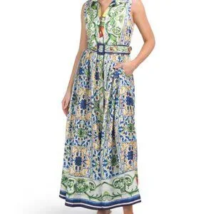 Bring a burst of Mediterranean energy to your wardrobe with this Dalia McPhee sleeveless maxi dress. Crafted from delicate, airy fabric, it’s light, flowy, and perfect for warm weather. The vibrant tile print evokes Italian vacation vibes, while the removable belt allows for versatile styling — swap for a straw or raffia belt for a relaxed, resort-ready look. True to size, flattering, and comfortable, this dress pairs beautifully with espadrilles, sandals, or wedges for effortless summer style.