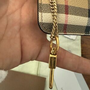 Burberry's Kelbrook Wallet Great Pre Loved Condition. This design is adorned with a vintage check pattern with a dog clip chain strap.