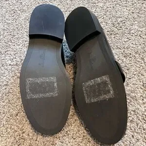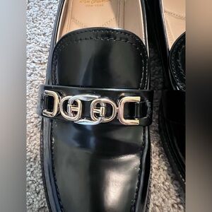 Elegant black loafers with a sleek finish. Ideal for versatile styling. Gold and silver details. Slight mark on one shoe shown in picture. Only ever worn around the house to try on.