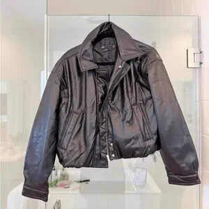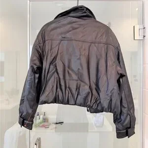 Stylish black leather bomber jacket. Features classic design and comfortable fit. Ideal for versatile wear.
