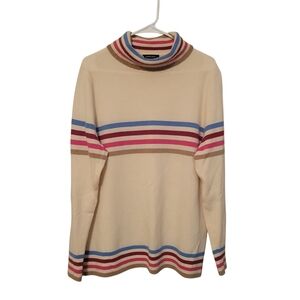 Coxy meets classic in this luxurious Lands' End wool/cashmere blend turtleneck sweater. Crafted from a soft, premium knit, it features retro inspired multicolor strips across a neutral cream background. The relaxed fit makes it perfect for layering or wearing on it's own!