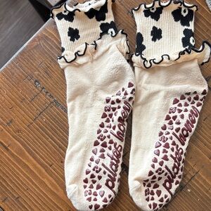 Lucky Honey Pilates Cream socks with black floral pattern and ruffle trim. Non-slip grip on the sole. Worn and washed once.
