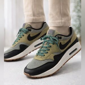 Classic Nike Air Max 1–style sneakers featuring a stylish olive green, black, and gray colorway with teal laces and a gum rubber outsole. Made with a mix of breathable mesh and suede overlays for comfort and durability. Features Nike’s iconic visible Air unit for all-day cushioning.