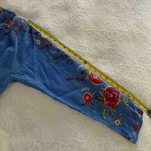French blue with multi colored floral embroidery long sleeve shirt. Content: Cotton. Single button closure at neckline for keyhole effect or leave open. Sleeves have 4 button closure. Tunic style. No bleeding, stains or rips. Like new condition.