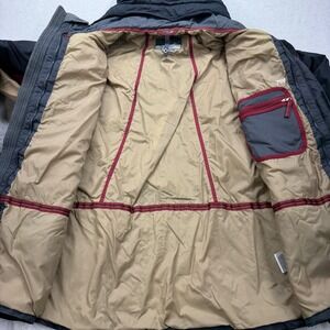 Nike hooded puffer jacket, designed for optimal performance and style. It features a full zipper and snap closure for maximum protection against the elements. Aesthetically, the jacket sports a striking color block design with a red horizontal stripe across the chest and khaki accents on the upper arms. Lined with multiple pockets, including an interior zippered compartment, perfect for skiing, snowboarding, or just braving a cold winter day.