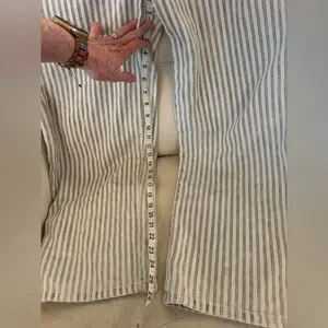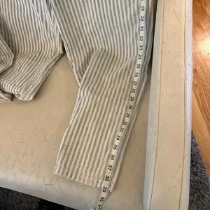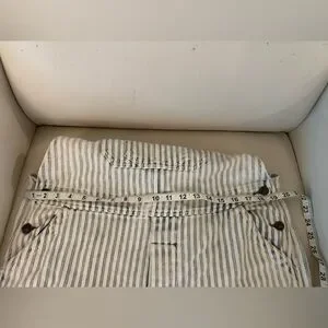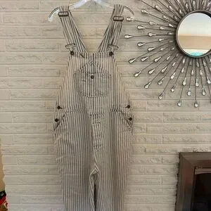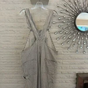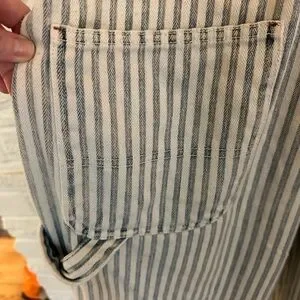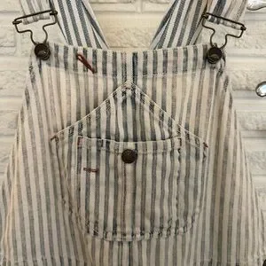 Stylish striped overalls with button details. Perfect for casual wear. Loose fit. Good used condition with one small stain (see photos( near the bottom of one leg.