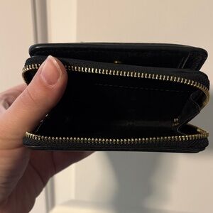 Chic black wallet by Tory Burch. Textured leather with embossed logo. Compact and stylish. Has slots for cards and section for change. Wallet is preloved. Given pebbles leather texture, there is some wear. Please see photos for wear.