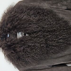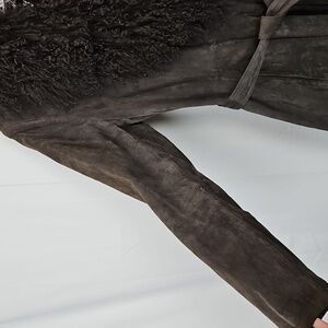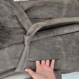 Vintage 1980's Marvin Richards chocolate brown suede leather trench penny lane style jacket with Mongolian lamb wool fur trim collar, leather tie belt, and quilted interior