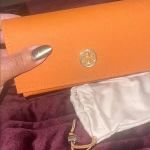 Sleek black sunglasses by Tory Burch. Includes a bold orange case. Perfect for stylish outings. Used less than 3 times very stylish