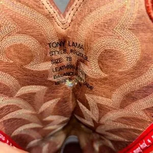 Elegant leather boots with detailed blue and red stitching. Ideal for a classic western style.