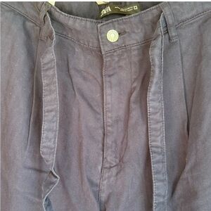New with Tag, Zara men's Navy Blue Drawstring Carrot Fit Rolled Cuff Chino Trousers Pants, size 34 US, twill fabric has navy blue subtle textured stripe weave, zipper with button & adjustable drawstring closure, front pleats, front slash pockets, back welt pockets, tapered legs with 13 inch leg opening.