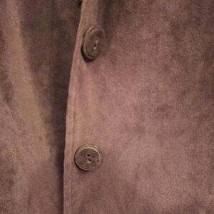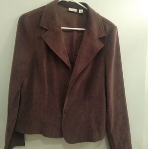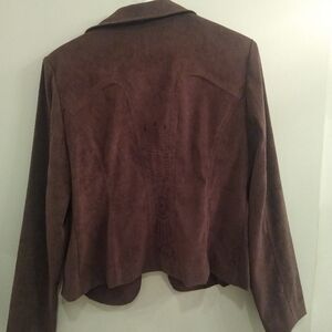 Blazer cut style with 3 buttons Fitted Chocolate color Faux suede like material Nice lightweight jacket Great for fall. Dresses up T-shirts or turtlenecks EUC Only worn a few times (I got fat). Purchased probably in 2015 or so.
