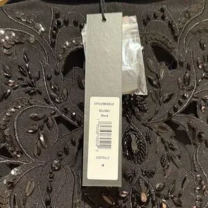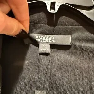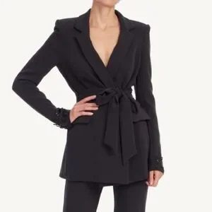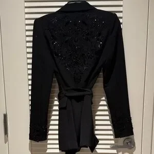 Elevate your work wardrobe with this stunning Badgley Mischka blazer. This wrap tie jacket features a flattering tie waist that accentuates your figure while securing closure. But the real showstopper is the exquisite beaded back detail, adding a touch of unexpected glamour.