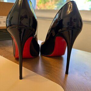 Christian Louboutin Pigalle Follies 100 Patent Size 38 Black. Worn twice and are just too big for me so buying a size down. Great condition, no scuffs, in box with shoe protectors. Extra heel applicators. Almost brand new.