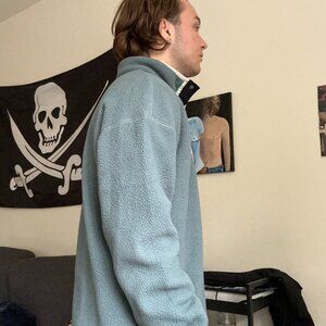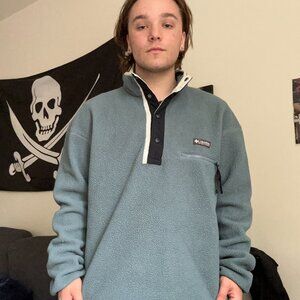 Model is 5'5 and wearing a size mens medium. Columbia fleece quarter snap style. Teal and super warm and comfortable. In good condition with a slight stain as pictured but doesn't impact wear and isn't super noticable.