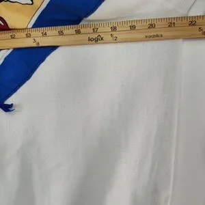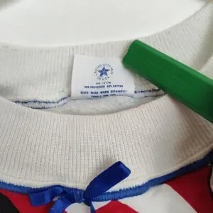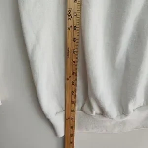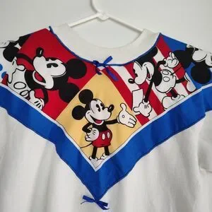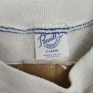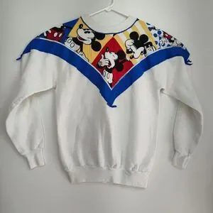 The Vintage Pannill Disney Mickey Mouse Pullover Sweatshirt is a vintage women's XL white sweatshirt featuring a graphic print of Mickey Mouse. It has long sleeves, a crew neck, and a pullover closure. Made from a blend of polyester and cotton, this knit sweatshirt is machine washable and has a regular fit. Perfect for activewear, this Disney-themed sweatshirt with a bow accent is a stylish addition to any cartoon lover's wardrobe. Made in the United States by Pannill, it embodies the nostalgia and charm of classic Disney characters.