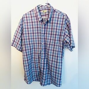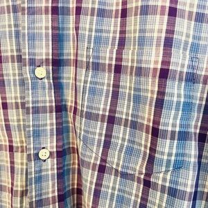 Haggar Button Down Short Sleeve Plaid Shirt in Eggplant, Azure, and Eggshell
