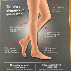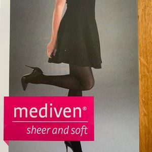 New Mediven Sheer & Soft are the sheerest medical compression stockings on the market. SilverPlus for prevention of uninhibited multiplication of bacteria on stocking surface COMPRESSION (15-20 MMHG) Heavily, fatigued, aching legs. Mild varicose veins with minimal edema. Mild varicose veins during pregnancy. Prevention or management of DVT.Fabric Content: 55% Nylon (Polyamide)/ 45% Spandex (Elasthane)/LATEX-FREE. Size III. Please refer to size chart ankle, calf, thigh measurements. These support stockings are offered at a huge discount to help those in need.