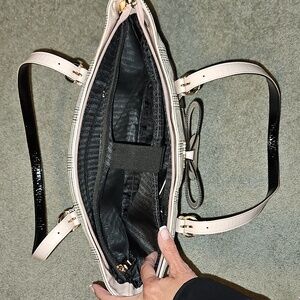 Discover elegance with this stylish plaid laptop tote featuring a delightful pink bow accent. Perfect for adding a touch of sophistication to any outfit. Very gently used. Pretty plaid pattern beige, pink & black. Wipe clean synthetic leather.