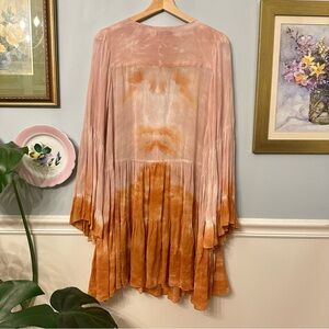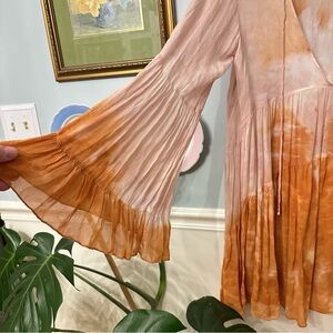 Young Fabulous & Broke pink and orange tie-dye dress with a deep V-neck. Sheer and flowy. Features flowing sleeves and a vibrant design. Size XS, but fits very oversized, see photos for measurements. Excellent condition, although the fabric content tag has been removed.