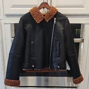 Stylish black jacket with plush brown teddy lining. Features a front zip and cozy collar.