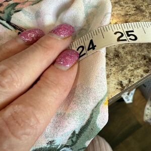 New with tags DN Design dress in size 22W. Features a pink, yellow, and green floral design, V-neck, and short sleeves. It has a zipper back and the color is blush gold.