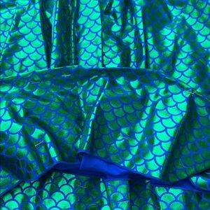 Glamorous mermaid costume with teal scales and silver accents. Includes top and skirt. Bra fits a 32 B cup. Some call outs: sequins needs repair near top bra strap on both sides, hem has stapling along the bottom. Both are easy fixes.