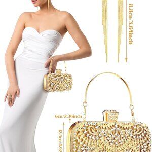 Features: This stunning set includes four rhinestone jewelry pieces—an elegant gold zircon necklace, a pair of silver needle earrings, a full diamond elastic bracelet, and a chic tassel earring. Plus, a gorgeous gold glitter clutch that fits your essentials effortlessly. The bag's sleek design with a spacious interior makes it perfect for cosmetics, phone, and keys, adding a touch of sophistication to your look. The optional chain allows you to wear it as a shoulder or handheld purse, matching well with the jewelry to elevate your aura. The clutch opens easily with a secure clasp, so your items stay safe.