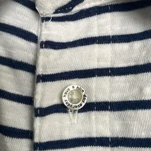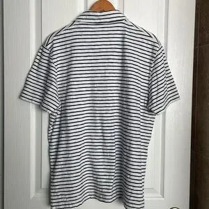 Classic black and white striped polo. Short sleeves. Button-up collar. Casual and stylish.