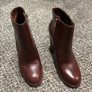 Chic tan leather booties with a sleek design. Perfect for elevating any outfit.