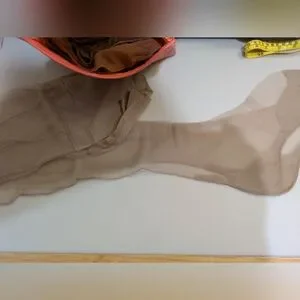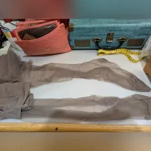 Includes seven pairs of stockings, thigh high stockings of the type requiring a garter belt. The black pair and first tan pair shown are seamed up the back. There are two pairs of the taupe colored stockings. One pair of the tan stockings have wear marks on the feet but the other six pair look unworn. I do not see any snags or damage but these are old and age-related flaws may be present.