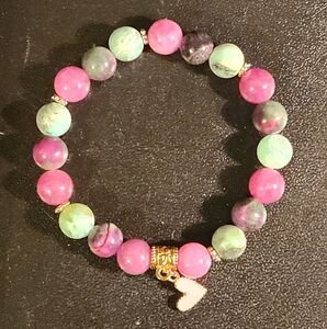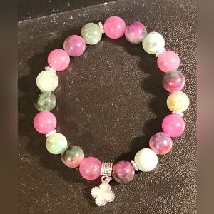 Elegant bracelet featuring vibrant 10mm pink and green stones, accented with a charm. Perfect for adding a pop of color to any outfit.