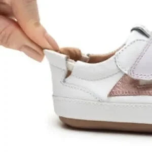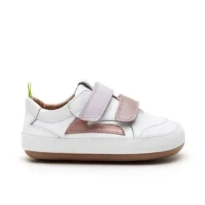 Step out in style and comfort with these Tip Toey Joey Landy Sneakers for girls. Featuring a crisp white leather base accented by colorful pink and rose gold straps with easy hook and loop closures. The flexible barefoot-style sole supports natural movement while adding a fun twist to every little step. Perfect for playful days and growing feet!