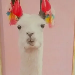 Charming llama art print with vibrant tassels. Perfect for adding a playful touch to any room. has some water damage shown in last photo not that noticeable