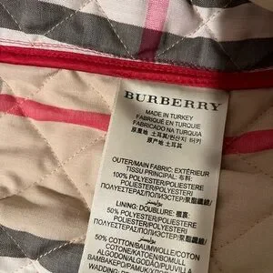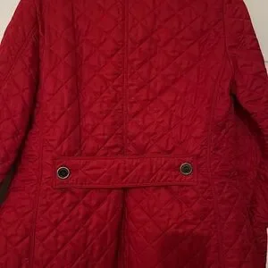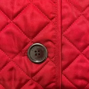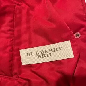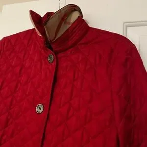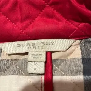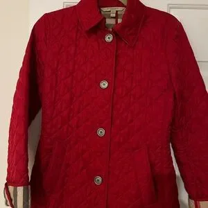 Elegant red quilted design. Features button closure. Classic Burberry style.