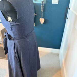 Zipped back, stretchy, form fitting up top with A-line silouette. Pockets, midi length, deep neckline. Fabric creates a beautiful body form and does not show undergarmets. Sexy, modest, and comfortable. Dark denim color.