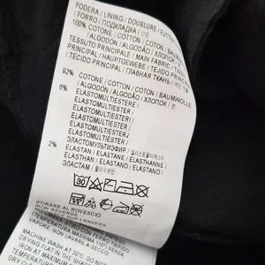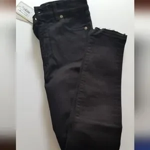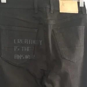 Features: black, high waist, skinny stretch, zip and button closure, pockets, "creativity is the answer " print at the back, designer logo, raw cut