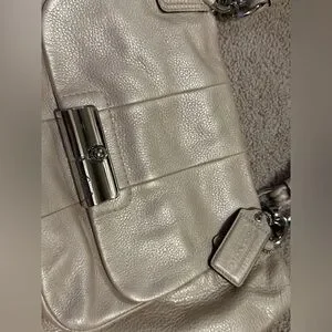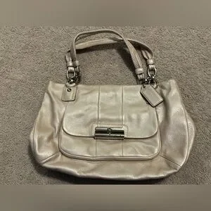 Chic Coach handbag with a metallic finish. Features a front flap and sturdy handles.