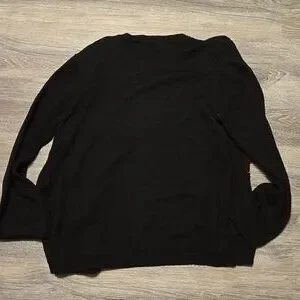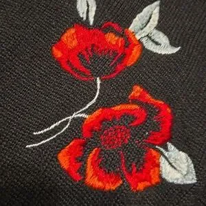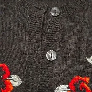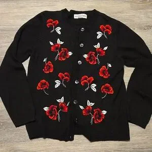 excellent pre-owned condition black button front wool blend cardigan with red embroidered Rose pattern