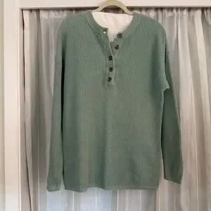 Soft, comfy, and perfect for layering — this Aerie sage green henley sweater is the ultimate cozy essential for fall. The chunky waffle knit texture, tortoiseshell buttons, and relaxed fit give it that effortless, “off-duty” look Aerie is known for.