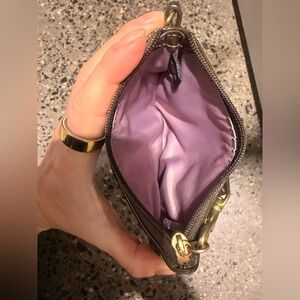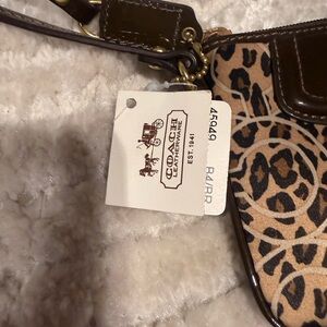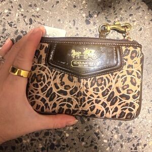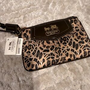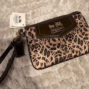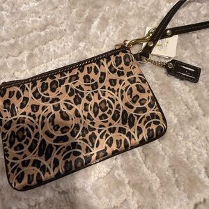 Chic Coach wristlet with animal print. Features black and tan design. Iconic logo detail.
