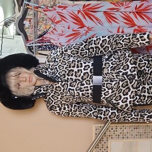 Faux Fur (feels real fur)lined hood. Bold jaguar print with black accents. Stylish and warm for winter sports. See my matching pants in other listing. More photos to come. Ski. Fur on hood and the hood are detachable.Please be aware of Goldbergh sizing. No returns.