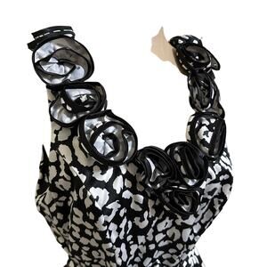 Jackie Jon size 10 Blouse Black & White Satin Rosette Neckline Sleeveless Belted