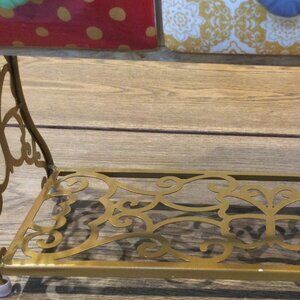 The rack features natural wood construction with a bronze colored metal base featuring a stunning scroll/ butterfly design.