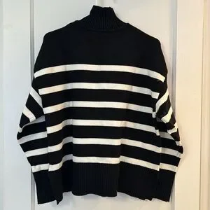 Stylish turtleneck sweater with bold black and white stripes. Perfect for a chic, modern look.