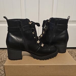 Step out in style with these chic black ankle boots featuring elegant gold accents. Perfect for any occasion, these boots offer both comfort and fashion. Boots are gently used, and have a small scuff (pictured) on left boot above heel. Do not have the original box.