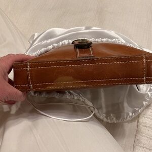 Patricia Nash Cognac Colored Leather Crossbody Bag. Good condition, but some discoloration on bottom. See photos for measurements.