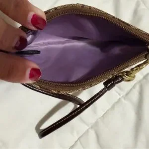 Chic Coach wristlet with signature pattern. Features tan and brown tones. Ideal for essentials.